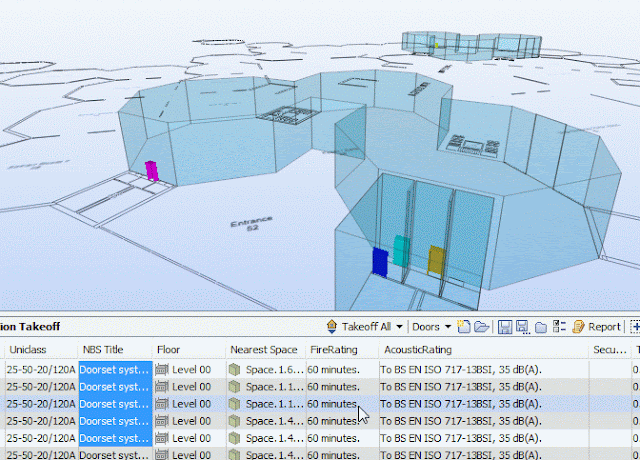 The model was at a more developed stage now and it was possible to start working on the objects within the building. The “Generate outline specification” functionality within the NBS for Autodesk Revit toolbar was used here. This loops through all of the objects in the model and generates an NBS Create specification with synchronised system objects. This functionality has not been released to market yet and Build Qatar Live 2012 was a good project to fully test this process. Fig 3 below shows the model in the design software. Fig 4 shows the NBS Create outline specification that was generated with a single click of a mouse.